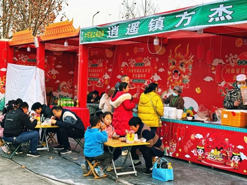 春節期間正常營業,全天候不間斷熬煮香噴噴、熱騰騰的胡辣湯,使美食街這家攤位成功出圈,一碗湯一張餅,日銷量高達3000份,濃濃河南特色,滿足了眾多游客的心和胃。