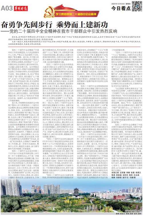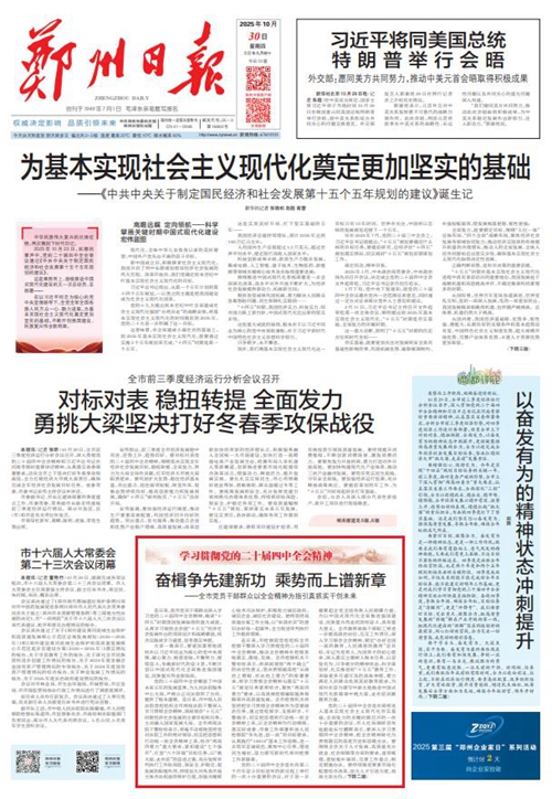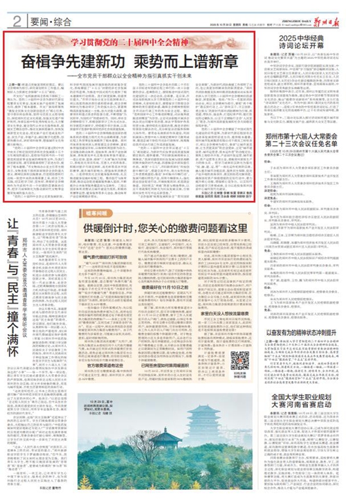 黨的二十屆四中全會擘畫了中國式現代化建設的宏偉藍圖,為新時代新征程國有企業改革發展指明前進方向、提供根本遵循,鄭州城發集團廣大黨員干部群眾深受鼓舞、倍感振奮。近日,《鄭州日報》《鄭州晚報》開設了【學習貫徹黨的二十屆四中全會精神】專欄,2025年10月30日,報道了鄭州城發集團深入學習貫徹落實黨的二十屆四中全會精神,以全會精神為指引真抓實干創未來。