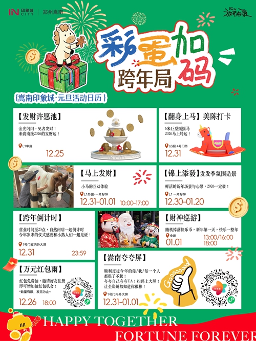 12月31日-1月3日,憑快樂幣可免費騎小馬、抽獎、兌換零食禮包,輕松實現童趣與味蕾雙重滿足。跨年夜,商場營業時間延長至23:00后自然閉店,大屏同步跨年倒計時,和親友一起在歡呼聲中迎接2026,氛圍感直接拉滿!