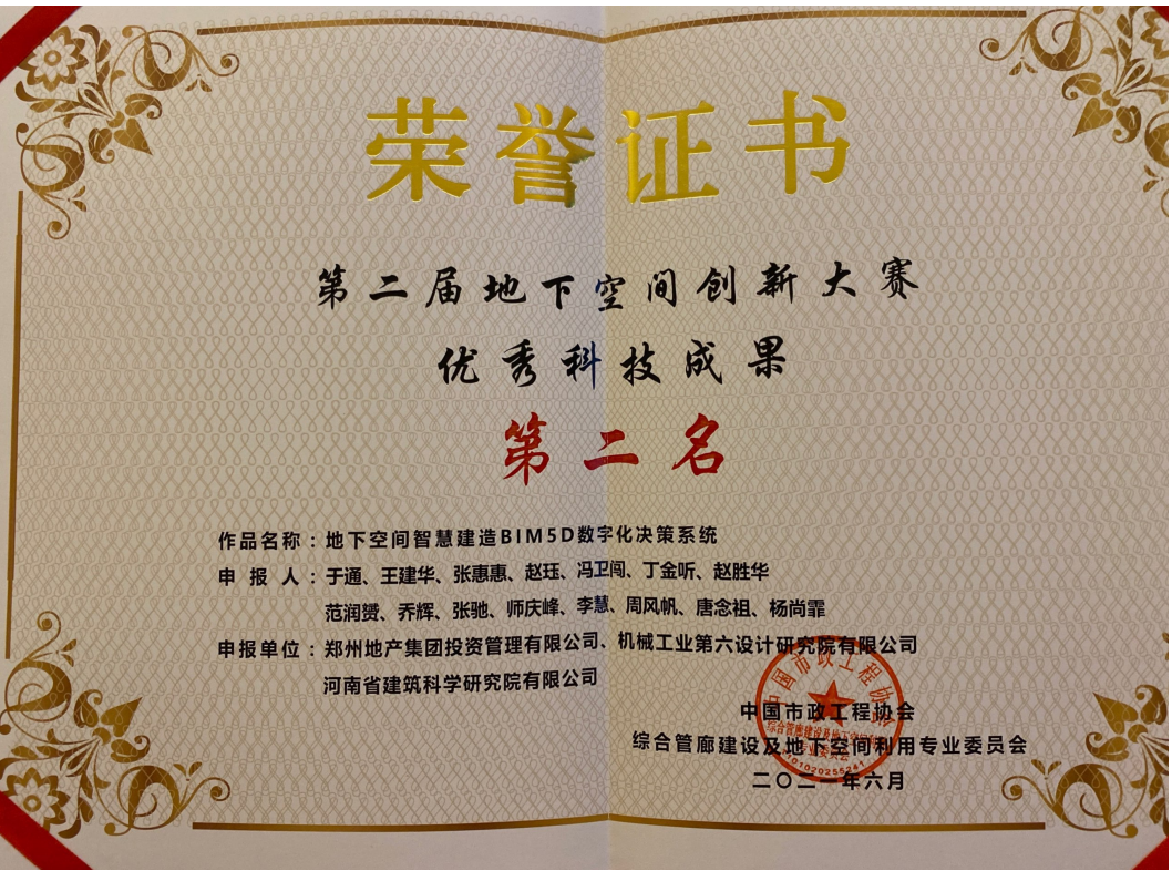 日前,鄭州地產集團投資管理公司參賽作品《地下空間智慧建造BIM5D數字化決策系統》榮獲“全國地下空間創新大賽優秀科技成果”第二名。