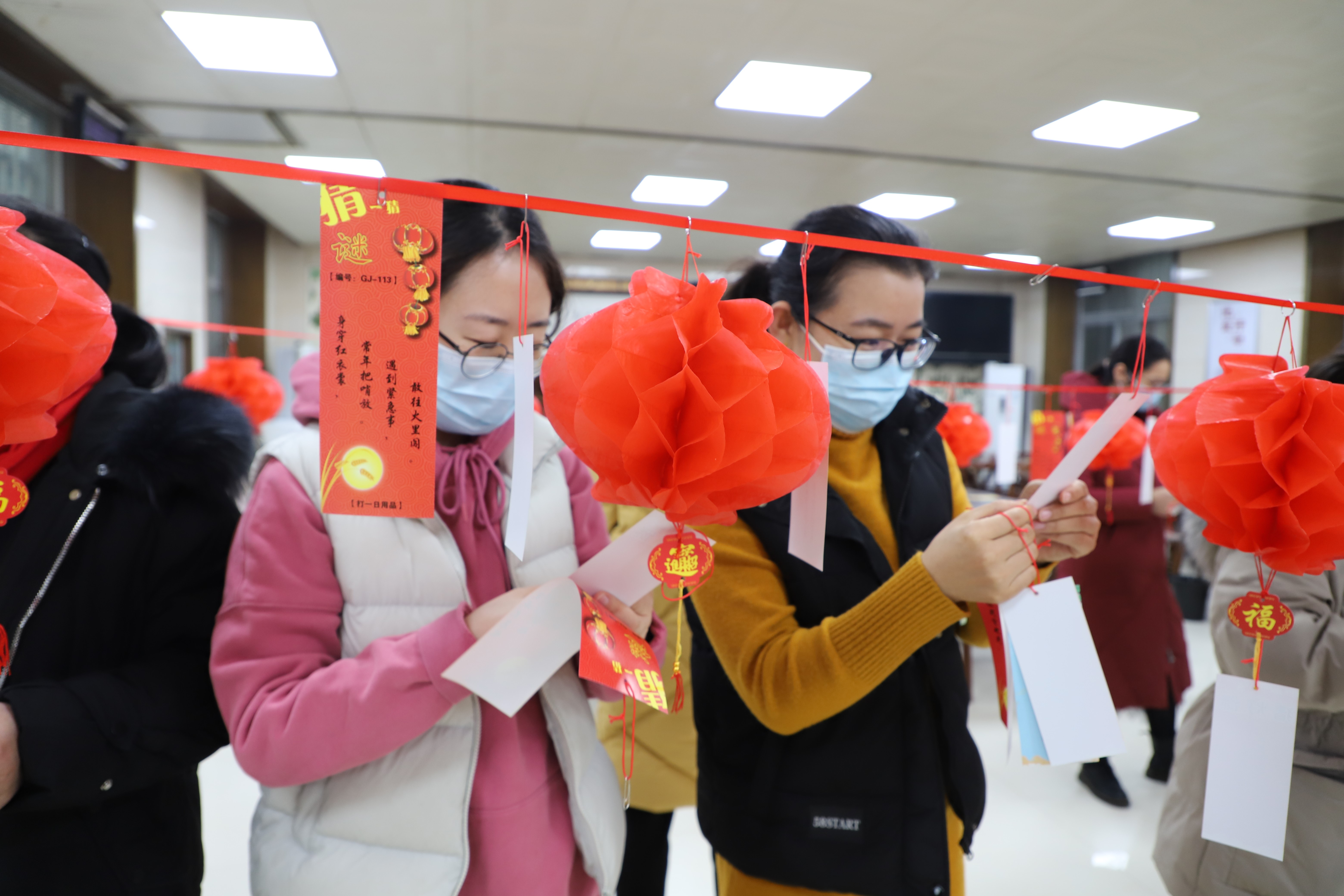 食堂內部,工作人員在充分做好防疫工作的基礎上,提前將二百余條顏色不一的謎語條高高掛起。謎語有猜成語的,有猜動物花鳥的,有猜歇后語的,有猜日常用品的,生動而活潑、面廣而量大。在益智填趣、娛樂生活的同時,更以這種傳統高雅的文藝形式展示了一方水土歷史、人文、民俗之特色與魅力,集趣味性、知識性于一體,讓大家樂中有學,共同領略祖國語言的無窮奧妙。活動現場,還為大家精心準備了春節相關的禮品,極大激起了參與職工的興趣。